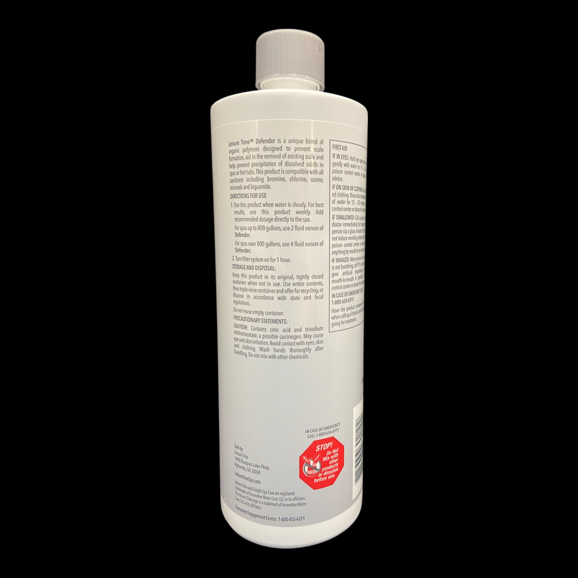 Leisure Time Defender is a unique blend of organic polymers designed to prevent scale formation, aid in the removal of existing scale and to help prevent precipitation of dissolved solids in spas or hot tubs. Defender by Leisure Time is a blended organic polymer that prevents scales and calcification caused by calcium.